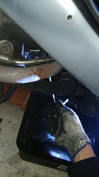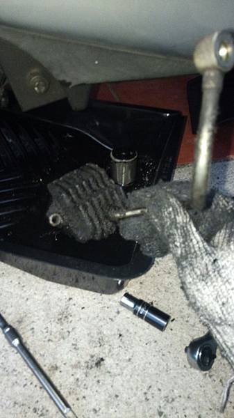 機油濾心蓋螺絲有兩顆,一長一短,上圖是短螺絲的解開方式,長螺絲在另外一邊,要使用10mm梅開板手解開(長螺絲的照片完全拍不到,哭哭)