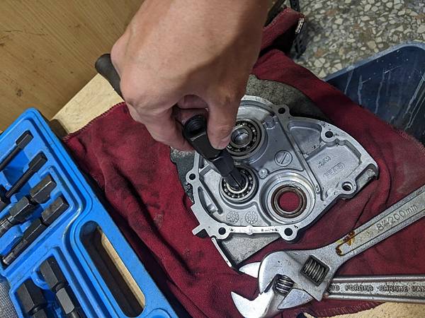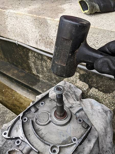 才怪....一次沒辦法直接對進去,我還是有用套筒,對準軸承外環,將軸承敲進去