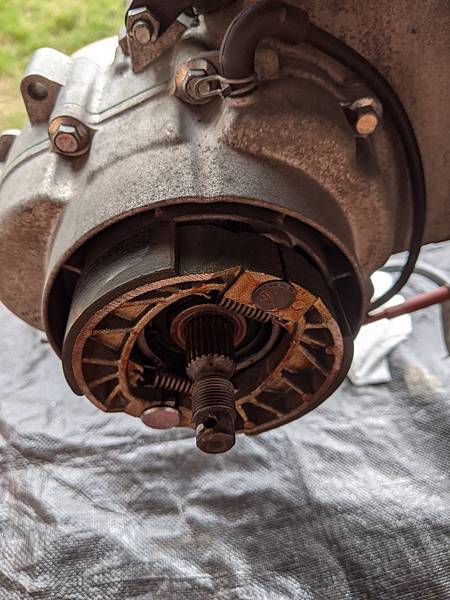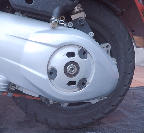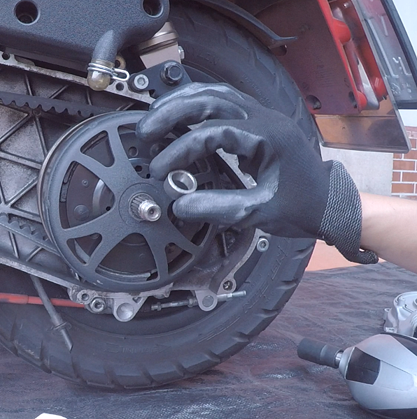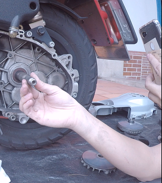 依序取下楓葉盤→離合器皮帶→普利盤,可當我在取下離合器的時候發現後輪軸似乎怪怪的...