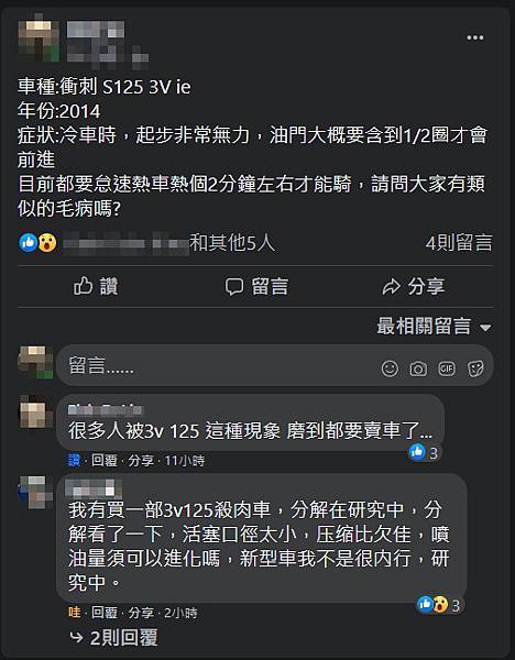 冷車時,引擎會無力到沒有辦法騎乘,試著把油門轉1/2圈之後,才會勉強開始前進,這個問題我也PO在FB臉書社團,大家也有這個問題...,而且還被磨到賣車了!?
