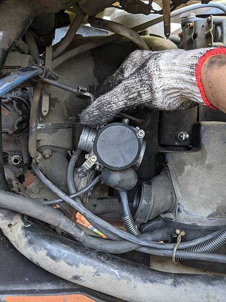 拆掉空濾盒,用手悶住化油器進氣口,並且調高怠速螺絲(幾乎鎖到底了),發現似乎可以怠速了