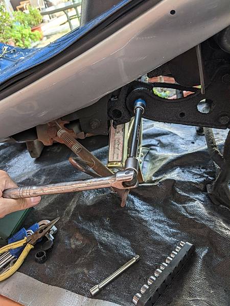 使用千斤頂頂著,拆卸後避震器