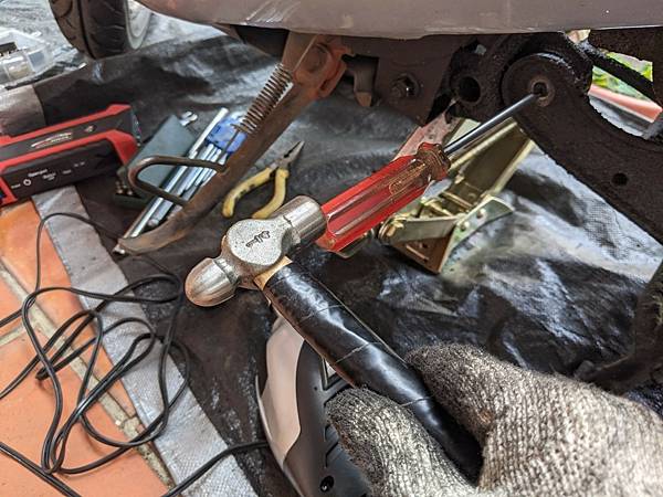 搭配鉗子+膠槌,利用蹺蹺板原理把剛剛的長螺絲頭往上敲(蹺)