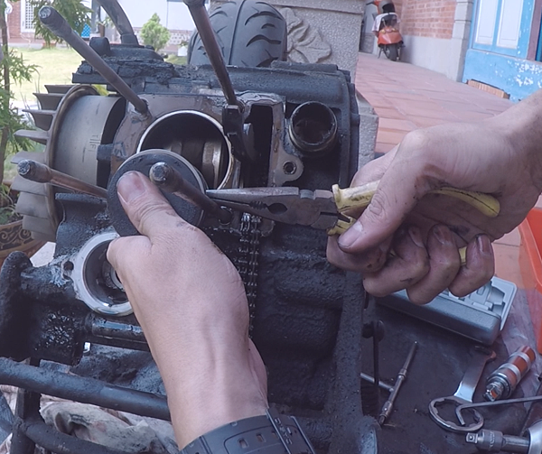 善用組裝手路,把汽缸套進去...(內鏈條記得先拉出來,用個東西把它拉著或掛著,讓它保持張力避免跟曲軸鏈輪脫離,例如鐵絲或者一隻老虎鉗)