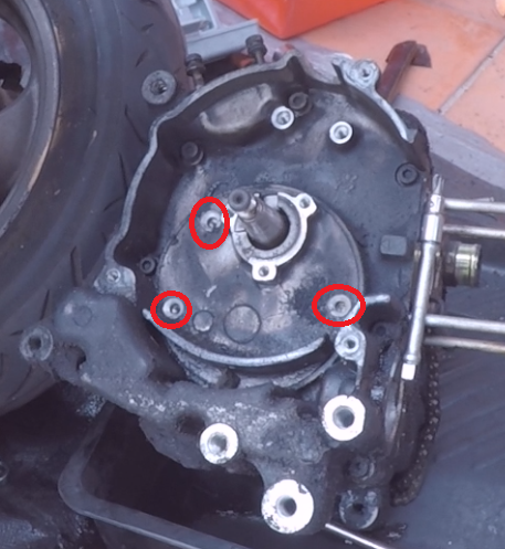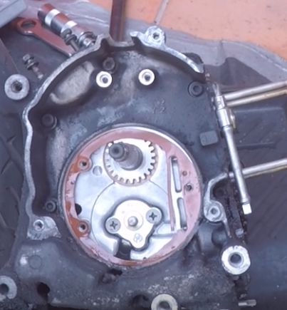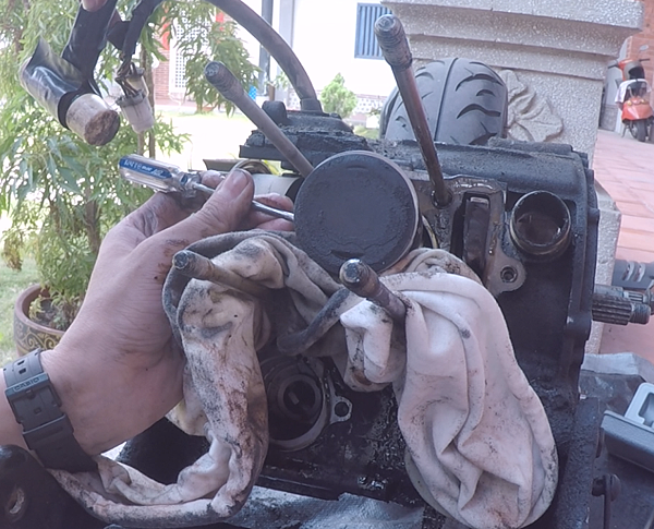 使用一字撬開外面的E環之後,發現機油泵的螺絲也同樣是十字的皿頭螺絲...(當初設計者對於自己的產品很有自信,完全不考慮到後續拆卸吧...)