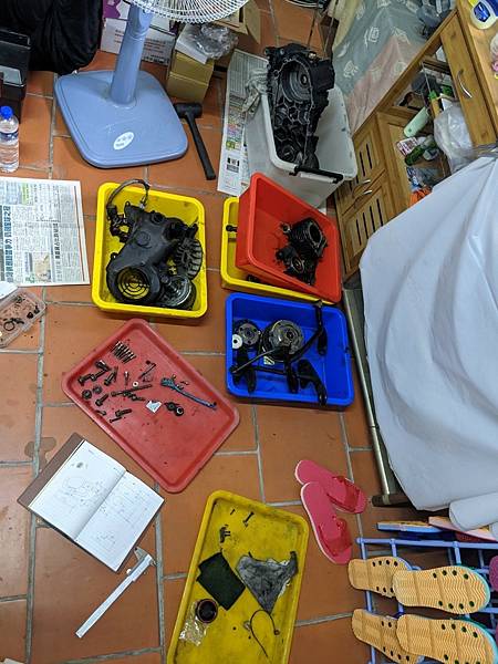 為什麼這麼說咧?因為拆引擎下來之後,那些零件占地面積在一個普通人的家裡,絕對不是一個小數目,而拆解、清洗、組裝引擎也會花個幾天工作天去做,仔細想想,那些髒兮兮的零件一直放在家裡,家人的想法是...,如果沒有跟家人溝通好,事前先說好,那也至少要有一個小小天地是你可以在這裡自由發揮個幾天,沒有人有意見,因為那裏只有你一個人自由玩耍,沒有人管你...