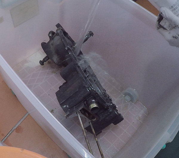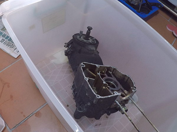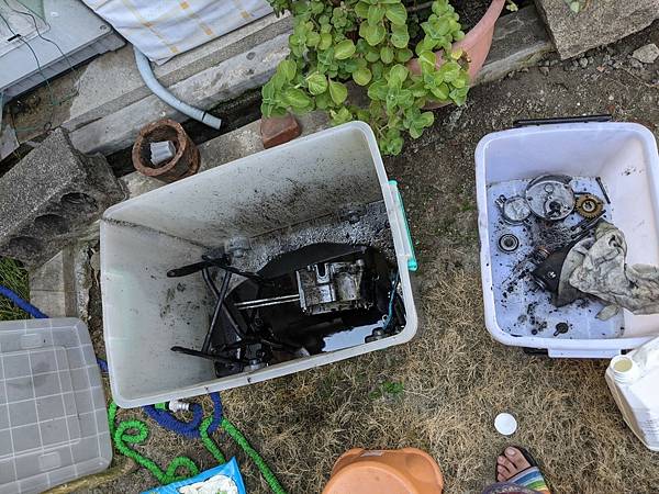 隔天,腰酸背痛的起床...把要洗的零件整理一下,就丟到大塑膠桶裡面...