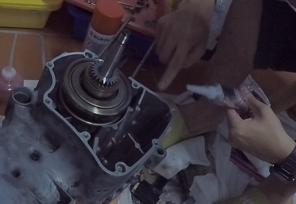 機油泵上膠之後慢慢敲入曲軸箱 (記得對它溫柔一點)