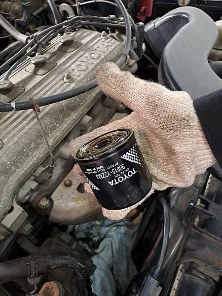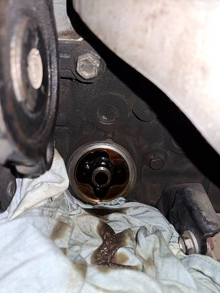 接著看到機油濾心,用塊布把濾心底下遮起來,不然機油會到處亂流