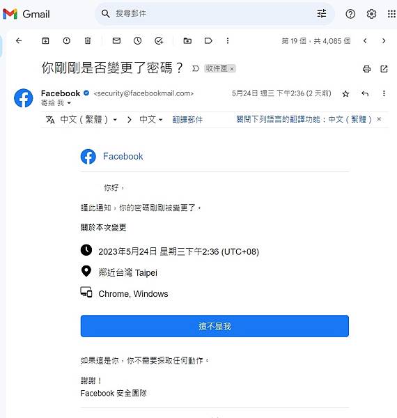 下班回到家我才收到這封E-mail...,我的臉書密碼被變更了!?我點下了圖片中的藍色按鈕"這不是我"
