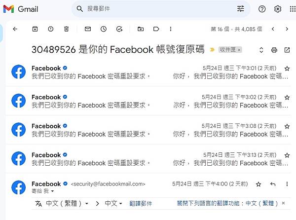 爾後,我嘗試想要從臉書把密碼變更回來...請臉書寄驗證碼去信箱,再從信箱點開驗證碼,然後臉書會顯示"驗證失敗"要我再重新驗證,這樣不斷的重複再重複這樣的操作...