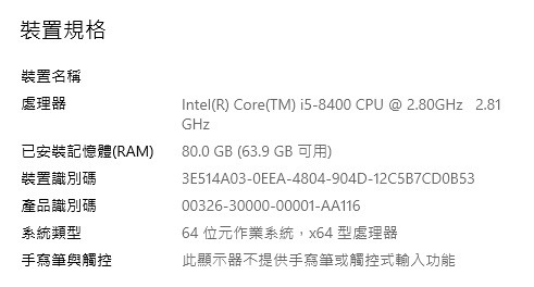 設定完一陣黑屏之後,又能夠回到桌面上了,看一下記憶體容量(80.0GB,但又特別標示63.9GB可用),感覺怪怪的,但我又沒有特別去多想,就繼續用