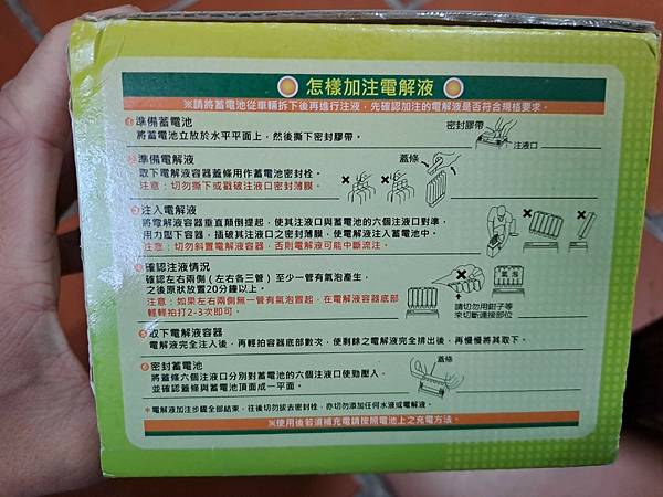 盒裝上面有標示清楚的加註電解液的步驟,照著做吧