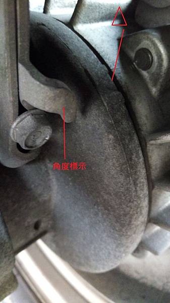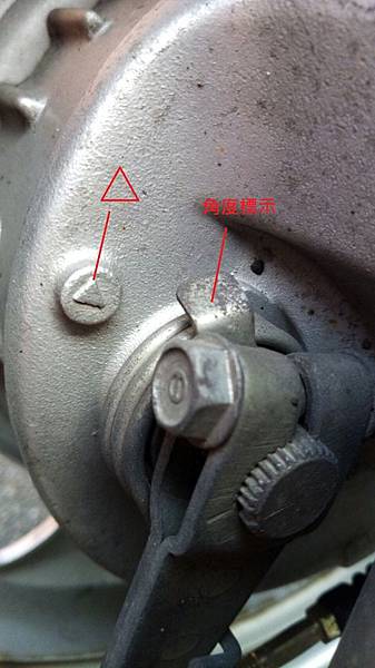 下圖是前輪的煞車軸, 每次煞車來令片磨損後,調整螺絲會調整一點點煞車軸的角度,當下圖中的角度標示接近或者已經對到,那就要換煞車來令片喔