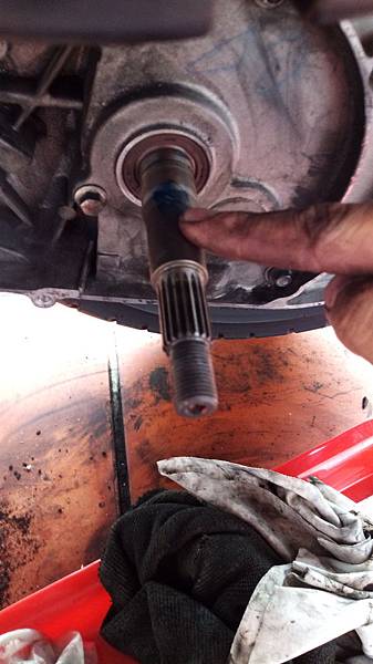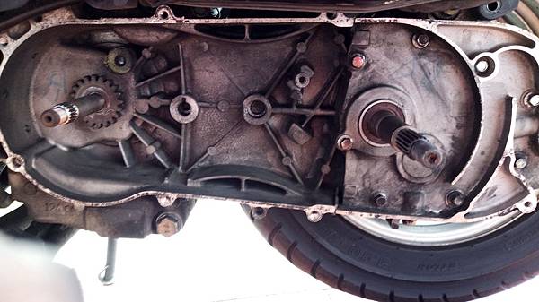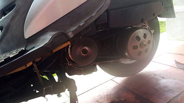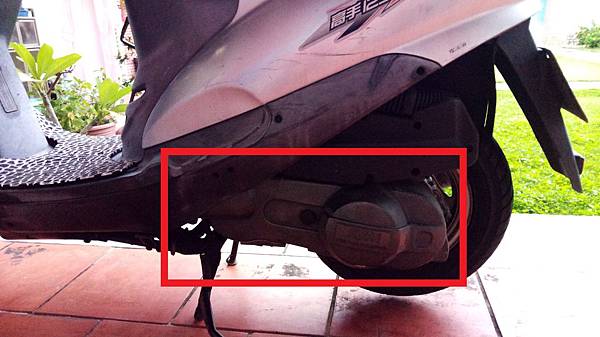 後輪旁邊這個箱子,裡面是CVT變速系統,引擎輸出旋轉之後,經由它變速,再加一個齒輪箱輸出旋轉給後輪...,要解釋理論是解釋不完了,反正它會磨耗,約10000公里檢查一次