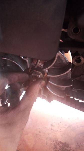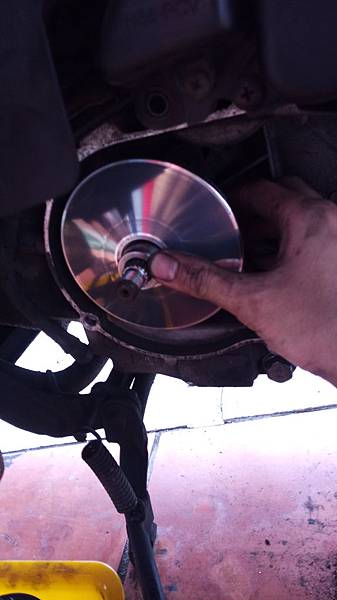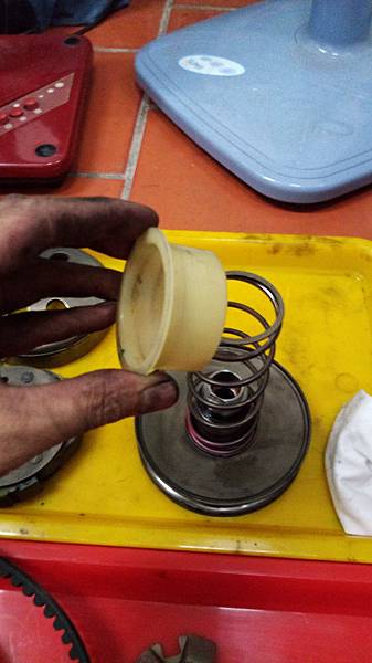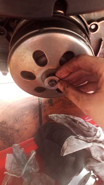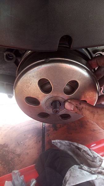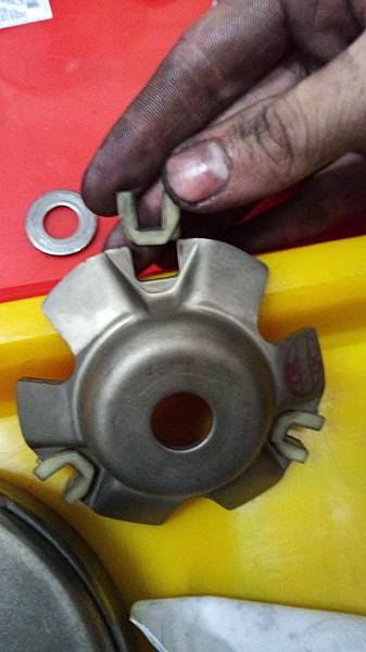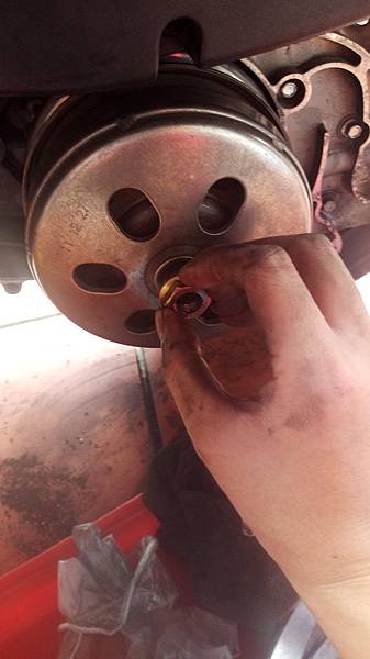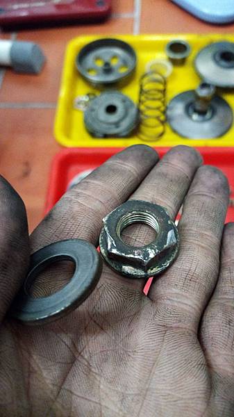 (搭配性感藍白脫) 壓著離合器,逆時針解鎖螺帽,避免解鎖瞬間大彈簧把零件噴飛