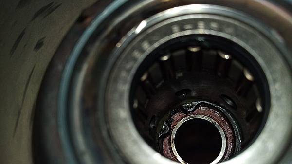 傳動皮帶輪裡面是滾針軸承(圖上)與滾珠軸承(圖下),可以摸摸看它們是否還滑順